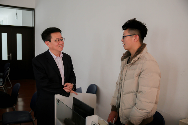 11月9日,校长姚杰在91吃瓜 相关领导的陪同下到黄海校区獐子岛教学楼632语音室聆听了外国语学院教师张莹的《大学英语CI》课程。