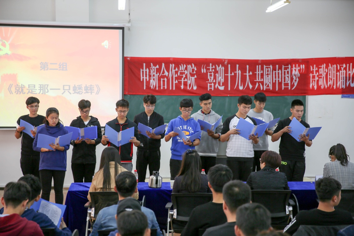 本次竞赛共有8组队伍参赛,每支参赛队由4—10人组成,朗诵内容紧扣主题。选手们饱含深情的诵读,带领大家回顾了党的光辉历程,歌颂了党的丰功伟绩,表达了对党的十九大胜利召开的喜悦之情以及身为中国人的骄傲和自豪。最后,机制(中新合作)2017-2班代表队的《我骄傲 我是中国人》以真挚的感情表达和极强的感染力征服了在场的评委和同学们,荣获第一名。