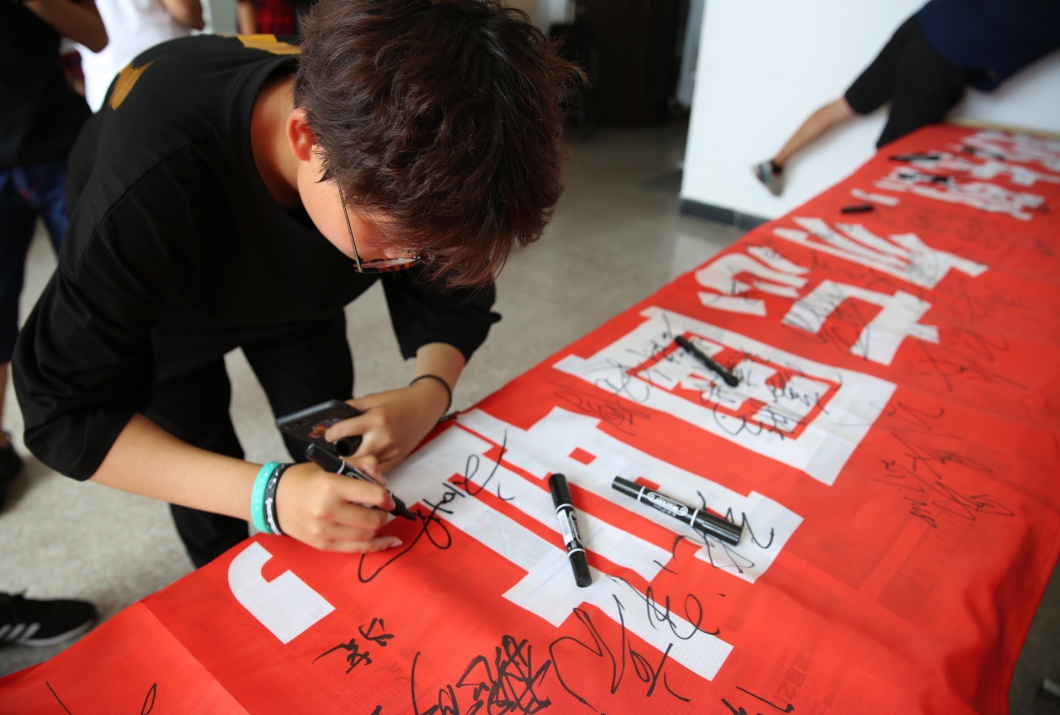 9月18日中午,签名仪式开始,学院在办公楼入口处拉起横幅,全体同学踊跃参与,在条幅上郑重地签上了自己的名字,表达自己的爱国热情。部分其他学院的学生参加了本次活动。