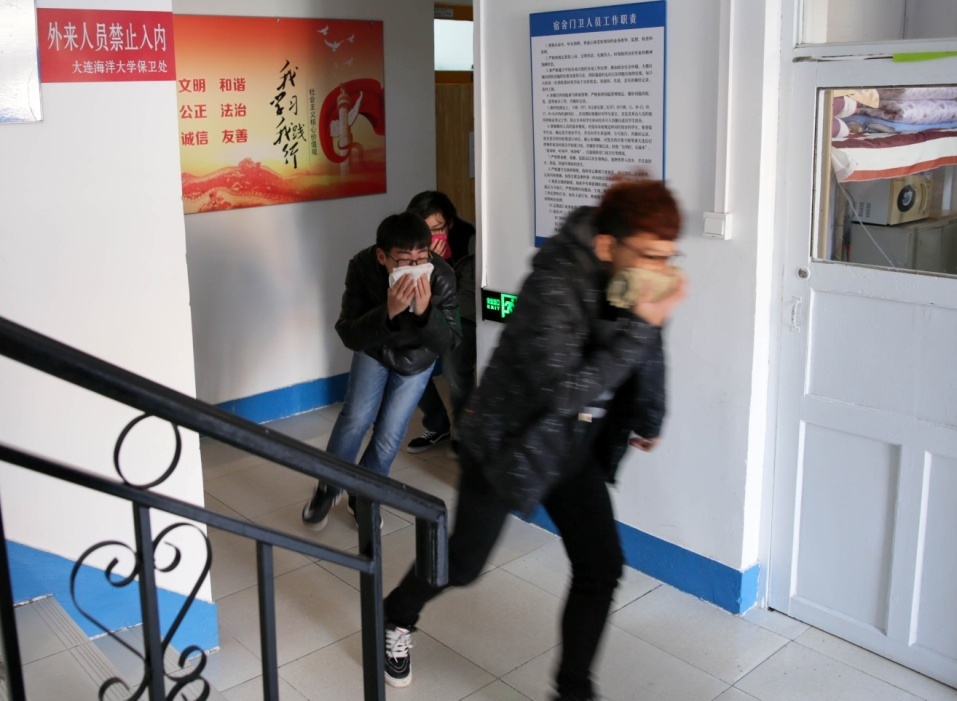 疏散演练正式开始,警报声响起,同学们用湿毛巾捂住口鼻,弯腰小跑,快速有序的撤离宿舍楼。