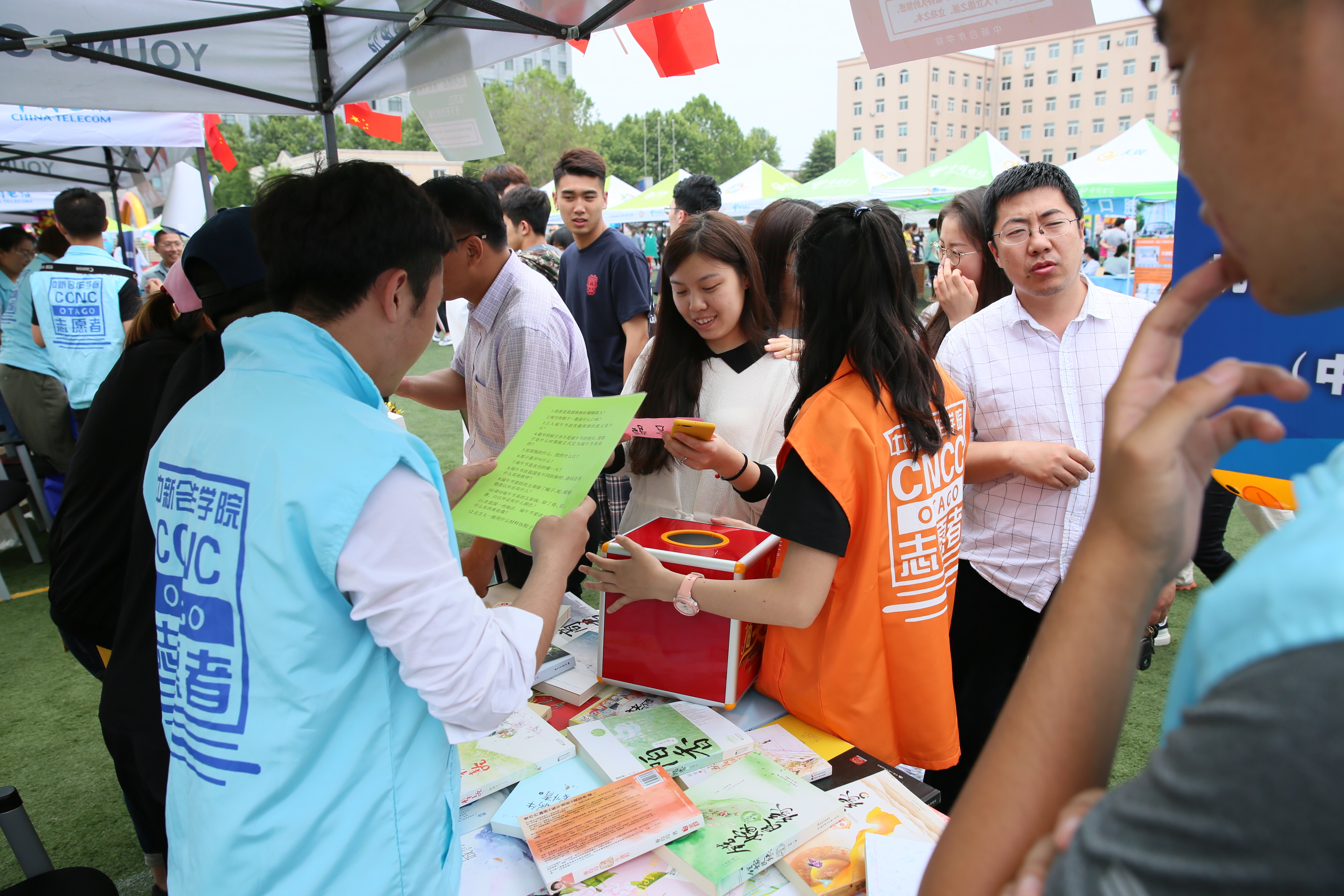 本次嘉年华活动主题为“I LOVE DLOU”,全场共分为9个主题区,我院负责 “iRed”板块——“端午节”活动主题。活动分为三个部分,其中“缘分编一编”是由学院同学现场指导各位游客进行五彩绳的编制;“爱心献一献”是爱心书籍义卖,游客们自愿购买,卖书所得将捐献给贫困儿童;“端午投一投”是游客们通过游戏互动赢取五彩绳,体会不一样的端午。