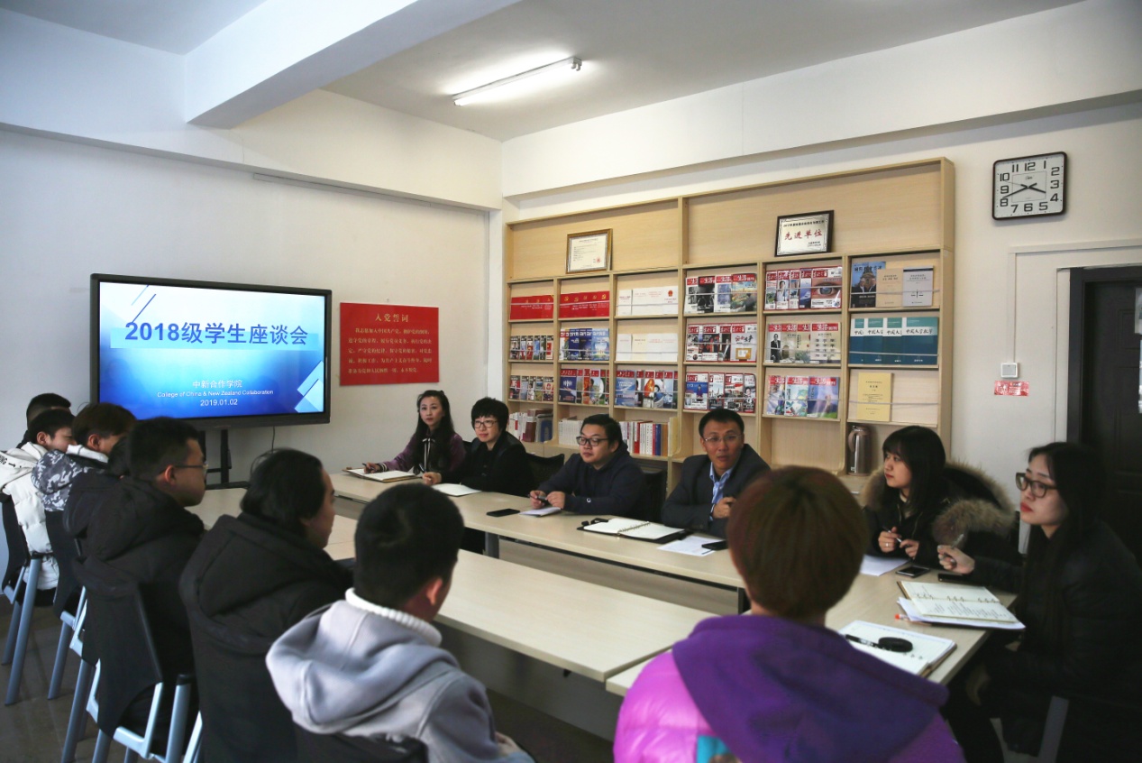 1月3日,91吃瓜 在学院会议室召开了2018级学生座谈会。新西兰奥塔哥理工学院北方项目办公室主任刘鑫及办公室工作人员、91吃瓜 院长高巍、党总支副书记邓艺、副院长张宁光、教学秘书李博雅、辅导员沈文静及2018级学生代表参加了本次会议。会议由2018级1班王坤鹏同学主持。