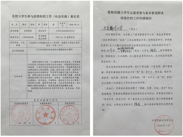机制(中新合作)19-3班陈龙同学在辽宁省阜新市彰武县哈尔套镇东哈尔套村值班值守检查点,全力协助村里落实疫情防控属地责任,做好路口执勤工作。对进入小区的人进行登记和体温测量,对外出娱乐活动和串门聚会的居民进行劝导。同时,为小区重点隔离对象进行24小时监测,给他们送食物和水等生活物资,并对他们的体温进行定时测量。疫情防控任务繁重,传染风险很大,但陈龙同学没有后退,坚守在抗击疫情的一线岗位上,用实际行动诠释当代青年大学生的担当与奉献。