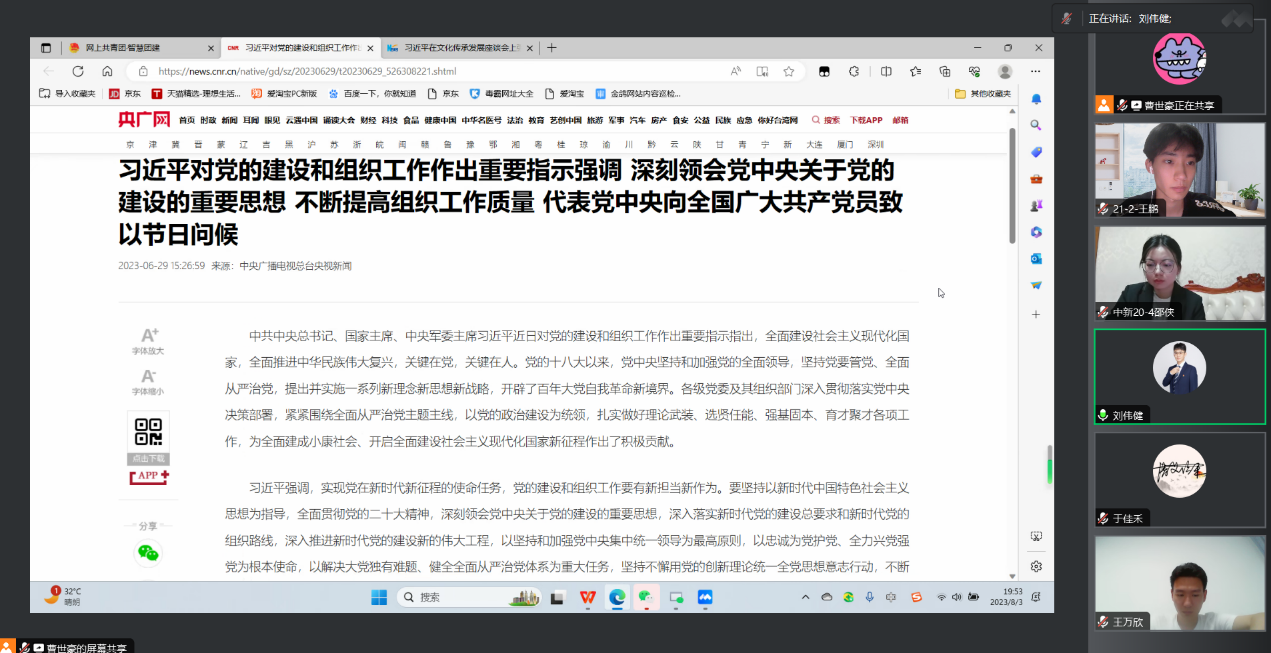 学生党支部线上通过腾讯会议开展了“学思想强党性、忠诚为党护党、全力兴党强党”主题学习研讨,学生党支部全体党员参加了学习。会议由党支部书记刘伟健主持。