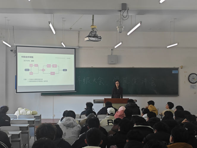 会上,沙雷重点强调了纪律要求,结合学生行为管理对同学们提出了明确要求。同时鼓励大家在新学期一定要严以律己,展现良好的精神风貌。李博雅围绕学院培养方案,系统讲解了学院基础课程强化-专业核心能力培养-外教授课特色三位一体的课程体系,详细阐述学分管理、课程重修及考务规定等教学制度,针对选课策略、补考重修等常见问题提供解决方案,帮助学生了解学院课程体系框架并明晰学业发展路径。