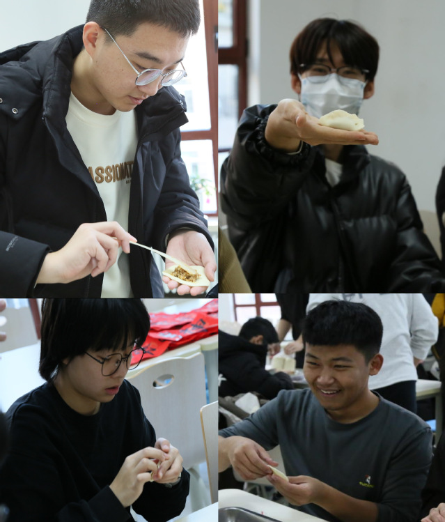 在包饺子环节中,学院为同学们准备了包饺子的原料和工具,同学们聚集在一起包饺子,心灵手巧,其乐融融,营造了热闹的节日氛围。